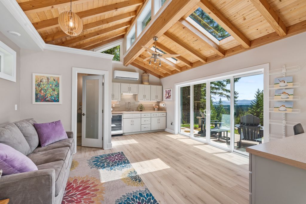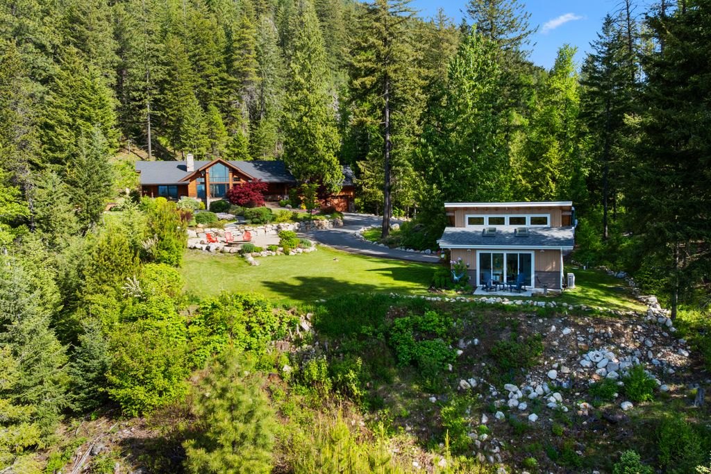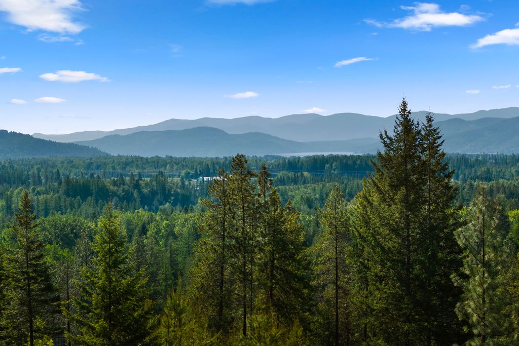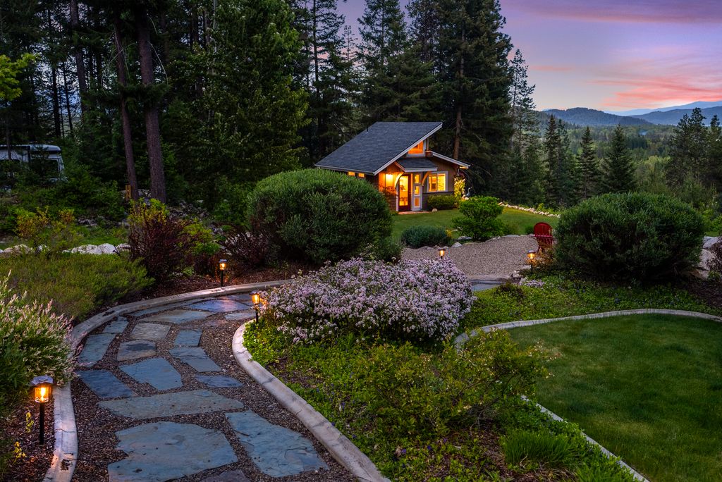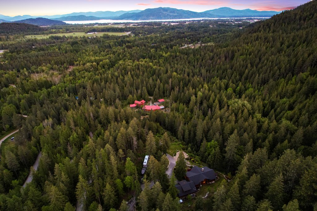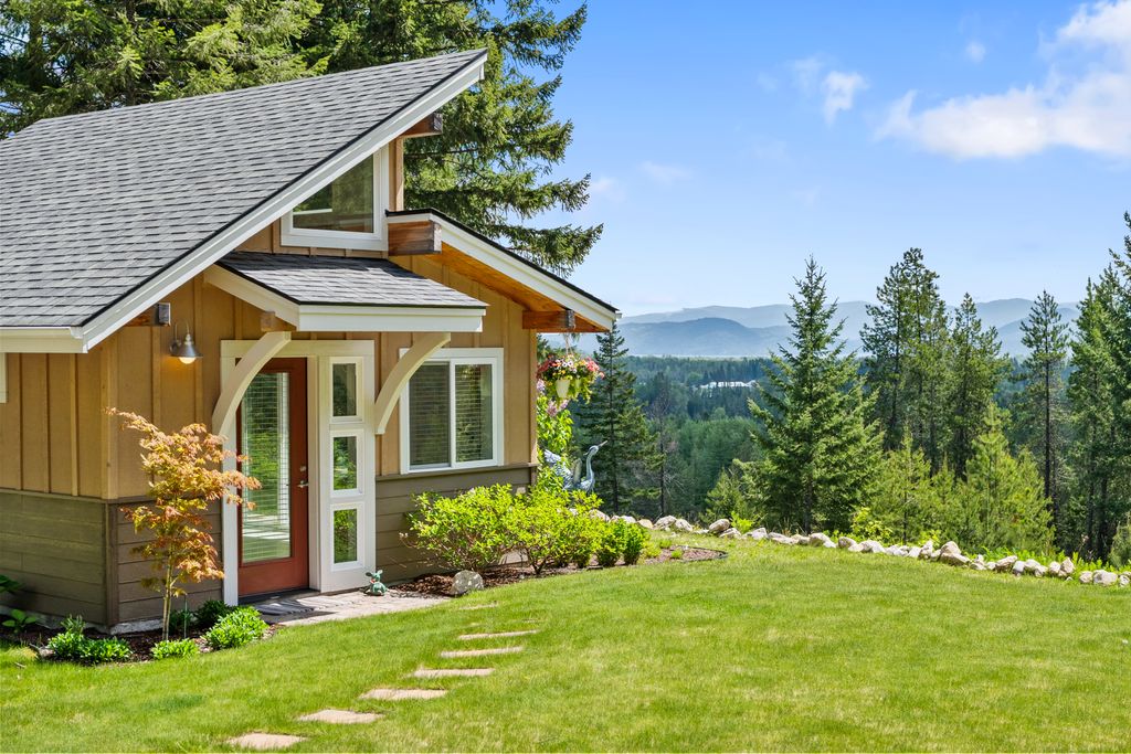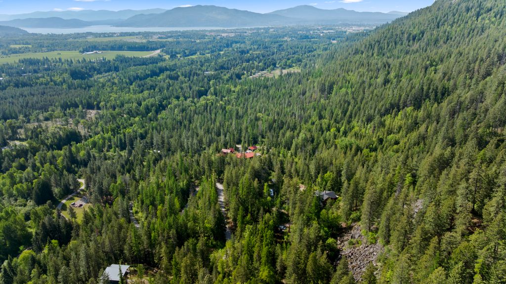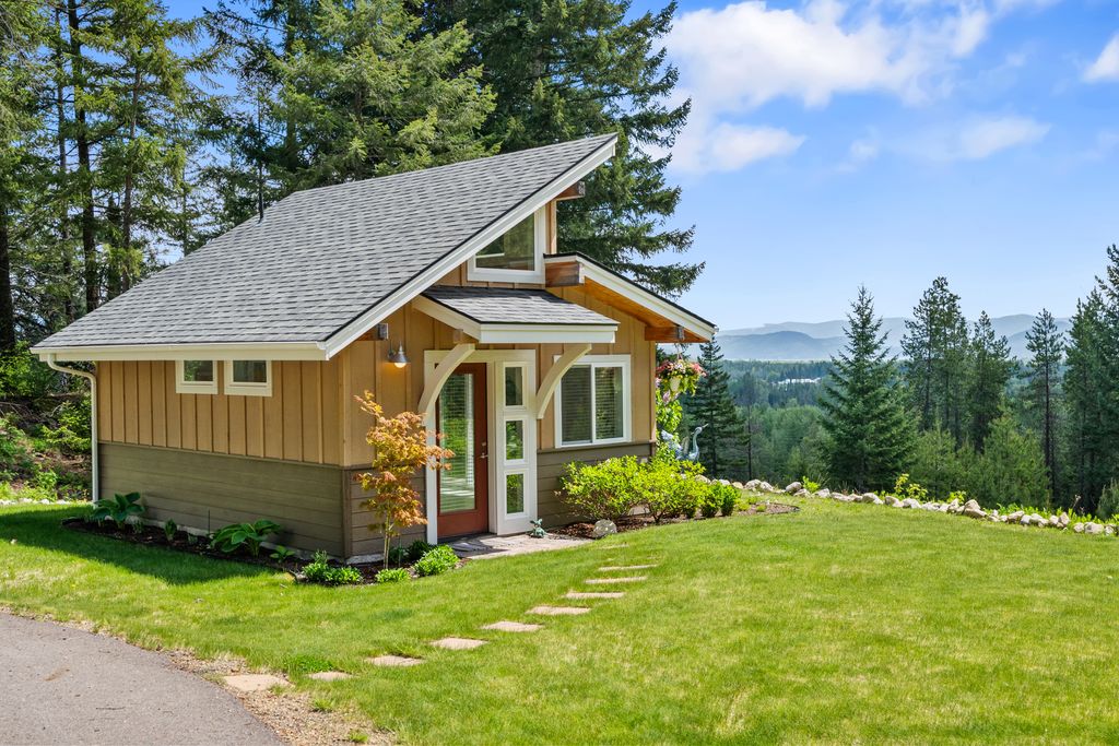 Meticulously constructed and artfully nestled into the foothills below Schweitzer Mountain, this exceptional property offers a rare blend of luxury, comfort, and natural beauty. With sweeping views of the surrounding mountains and the sparkling lake beyond, this home is a true haven for those seeking serenity, space, and inspired design. Bathed in abundant sunshine and softened by gentle mountain breezes, the home welcomes each day with stunning sunrises and a chorus of native wildlife. This 7.93-acre property is dotted with huckleberry bushes and thoughtfully landscaped with deer-resistant shrubs and perennials, providing a low-maintenance yet vibrant outdoor living experience. Inside, an open floorplan showcases exquisite craftsmanship, from exposed cedar beams, soaring tongue-and-groove ceiling to wide plank, wood grain tile flooring. Floor-to-ceiling windows frame breathtaking views and flood the home with natural light, while radiant in-floor heating keeps every space warm and inviting. The full masonry gas fireplace, clad in real stone veneer, anchors the great room with timeless mountain elegance. The gourmet kitchen is a chef’s dream, featuring ivory quartz countertops, a contemporary stone backsplash, high-end appliances and ample storage. The primary suite is a true retreat, with private access to two outdoor spaces, including a secluded deck with hot tub overlooking tranquil Schweitzer Creek. The en-suite bath is filled with natural light and finished with quartz countertops and heated travertine floors. Additional living spaces include a beautifully appointed 700 SF guest studio above the garage with a separate entrance, full kitchen, and bath—perfect for multi-generational living or guest accommodations. Two detached 320 SF custom studio spaces expand the property’s versatility. One features a kitchenette and bathroom, ideal for a home office, art studio, or guest quarters. The other is an off-grid escape overlooking the peaceful Selle Valley, offering unmatched privacy and inspiration. Whether you’re taking in the views or enjoying a peaceful stroll down to Schweitzer Creek, this one-of-a-kind mountain sanctuary offers not only a place to live—but a way of life.