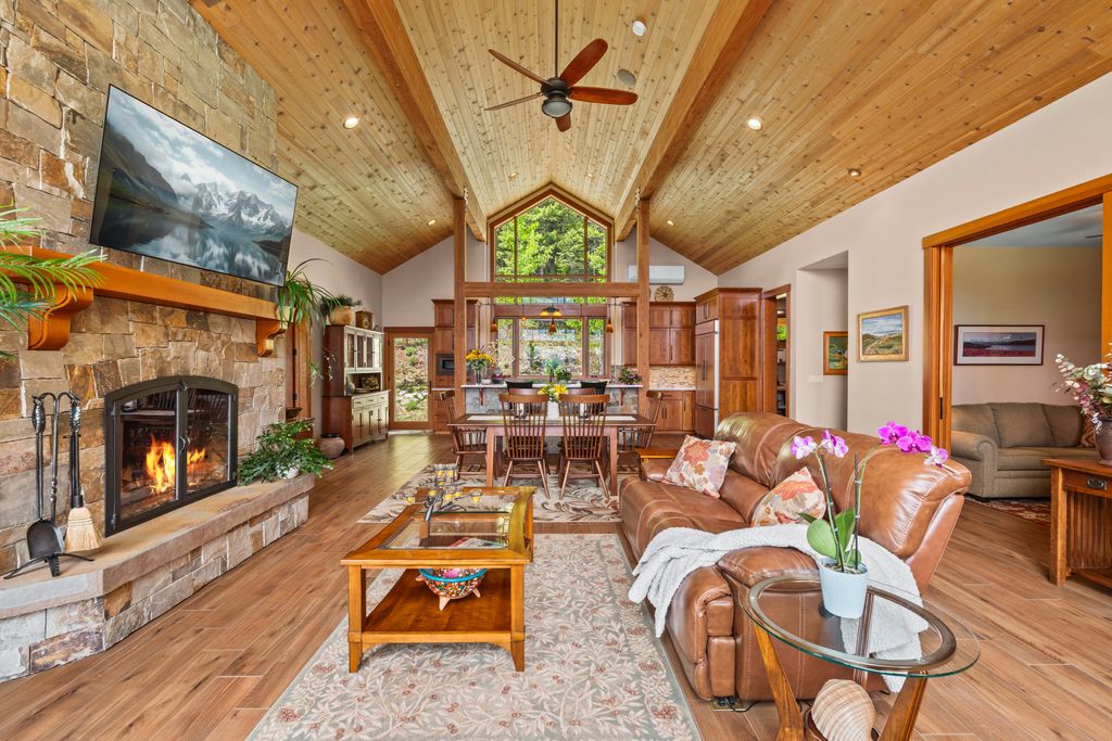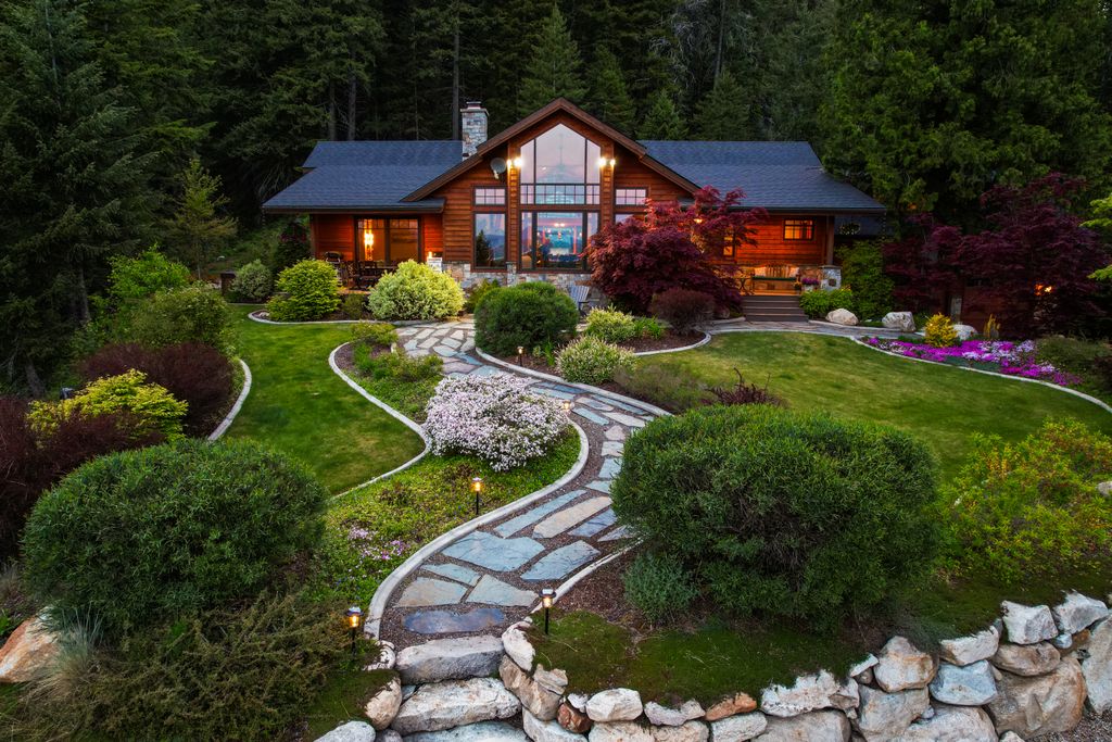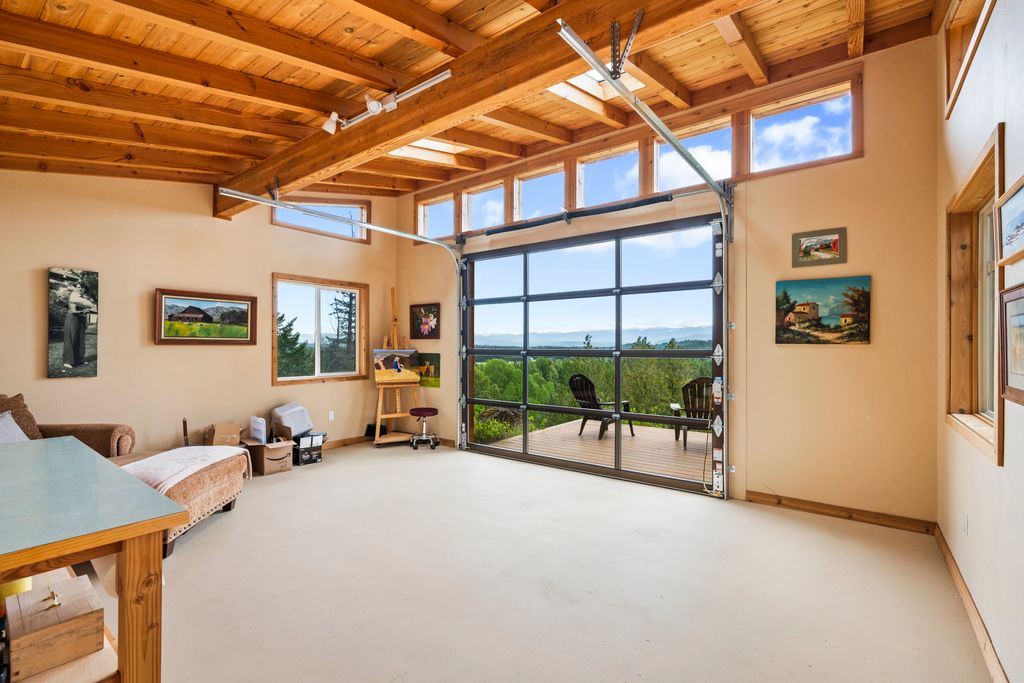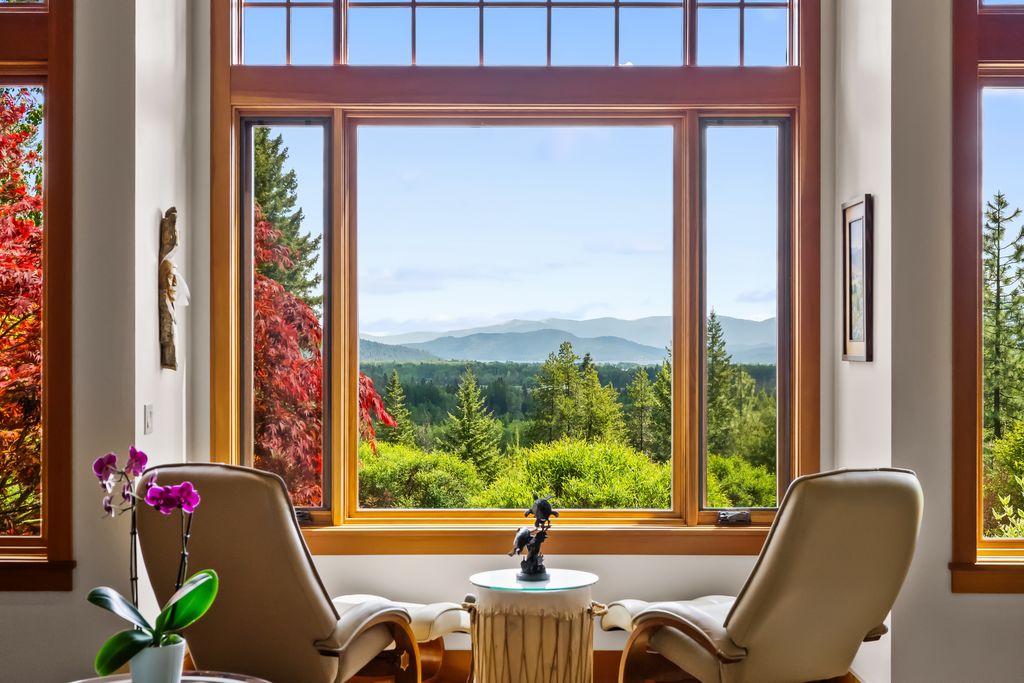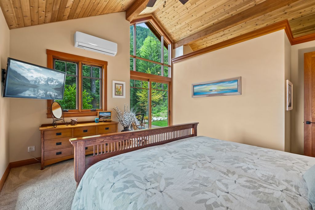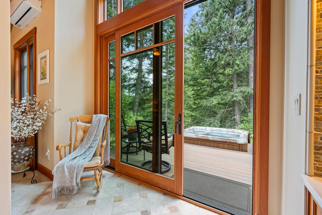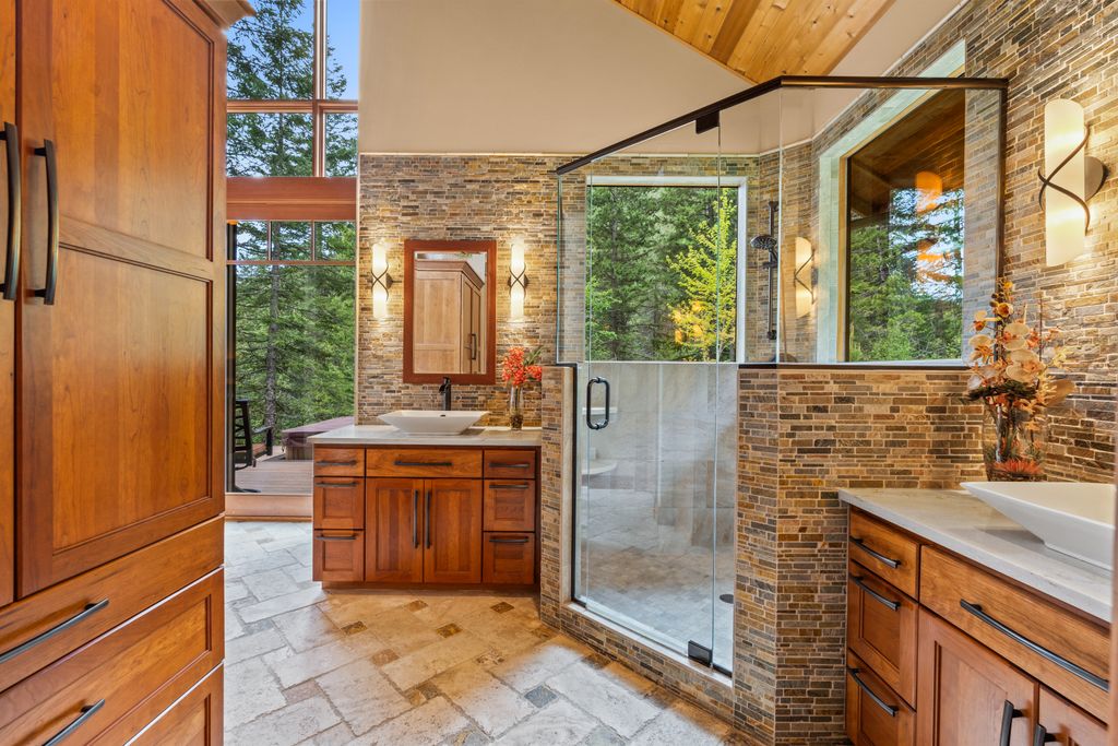 Meticulously constructed and artfully nestled into the foothills below Schweitzer Mountain, this exceptional property offers a rare blend of luxury, comfort, and natural beauty. With sweeping views of the surrounding mountains and the sparkling lake beyond, this home is a true haven for those seeking serenity, space, and inspired design. Bathed in abundant sunshine and softened by gentle mountain breezes, the home welcomes each day with stunning sunrises and a chorus of native wildlife. This 7.93-acre property is dotted with huckleberry bushes and thoughtfully landscaped with deer-resistant shrubs and perennials, providing a low-maintenance yet vibrant outdoor living experience. Inside, an open floorplan showcases exquisite craftsmanship, from exposed cedar beams, soaring tongue-and-groove ceiling to wide plank, wood grain tile flooring. Floor-to-ceiling windows frame breathtaking views and flood the home with natural light, while radiant in-floor heating keeps every space warm and inviting. The full masonry gas fireplace, clad in real stone veneer, anchors the great room with timeless mountain elegance. The gourmet kitchen is a chef’s dream, featuring ivory quartz countertops, a contemporary stone backsplash, high-end appliances and ample storage. The primary suite is a true retreat, with private access to two outdoor spaces, including a secluded deck with hot tub overlooking tranquil Schweitzer Creek. The en-suite bath is filled with natural light and finished with quartz countertops and heated travertine floors. Additional living spaces include a beautifully appointed 700 SF guest studio above the garage with a separate entrance, full kitchen, and bath—perfect for multi-generational living or guest accommodations. Two detached 320 SF custom studio spaces expand the property’s versatility. One features a kitchenette and bathroom, ideal for a home office, art studio, or guest quarters. The other is an off-grid escape overlooking the peaceful Selle Valley, offering unmatched privacy and inspiration. Whether you’re taking in the views or enjoying a peaceful stroll down to Schweitzer Creek, this one-of-a-kind mountain sanctuary offers not only a place to live—but a way of life.