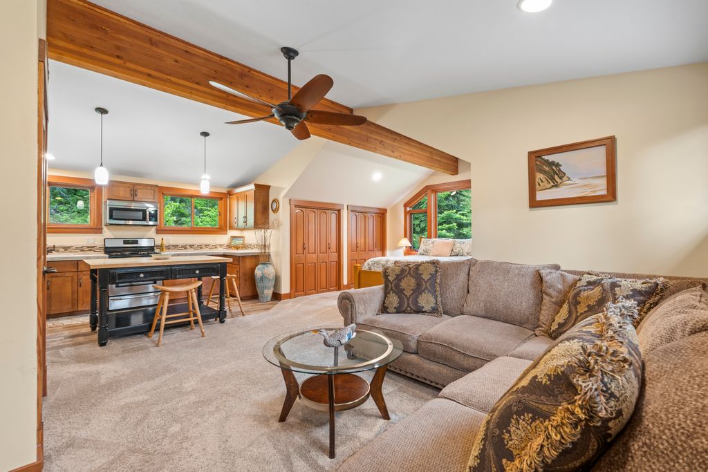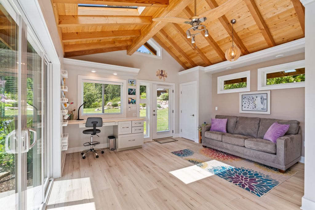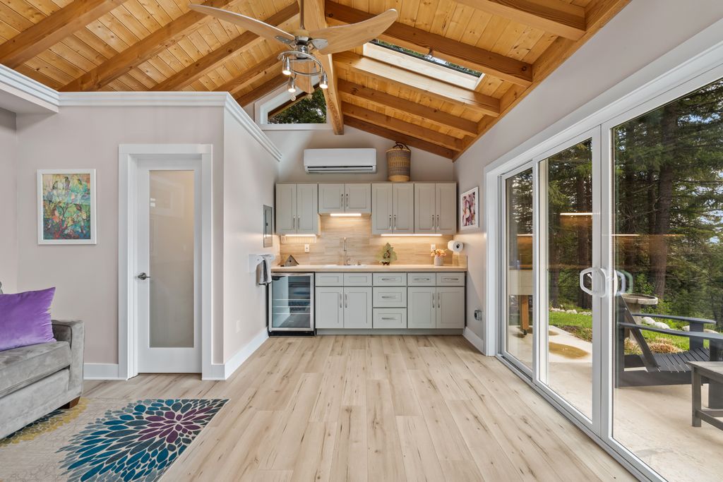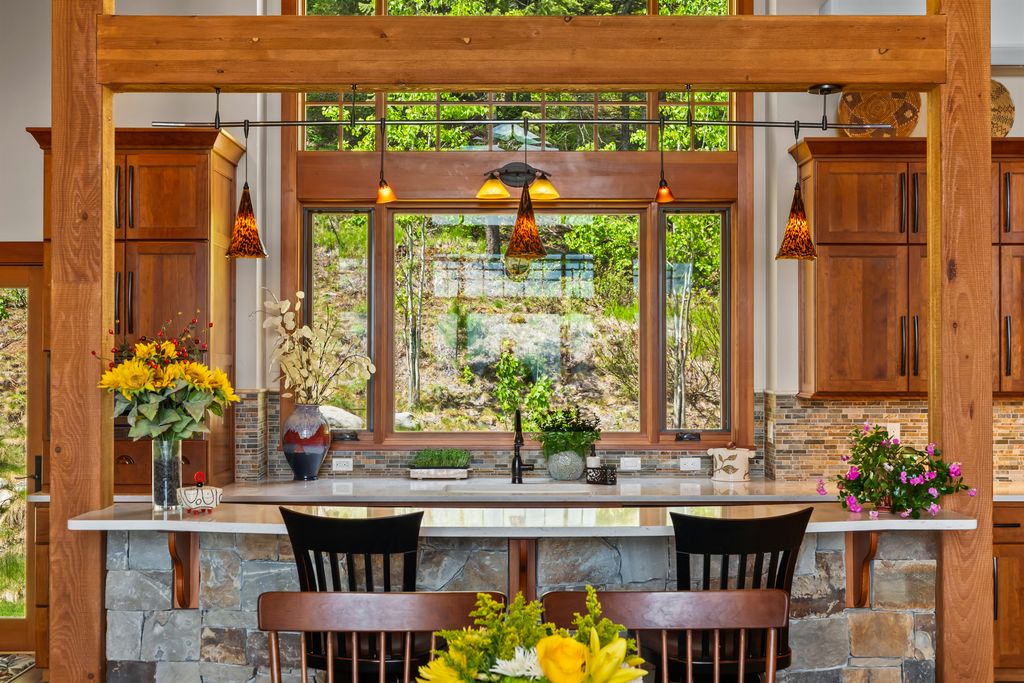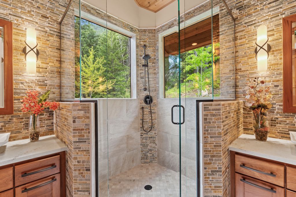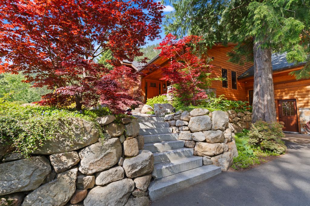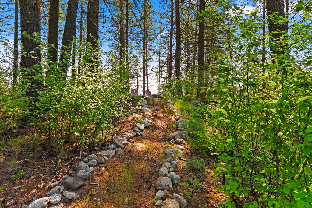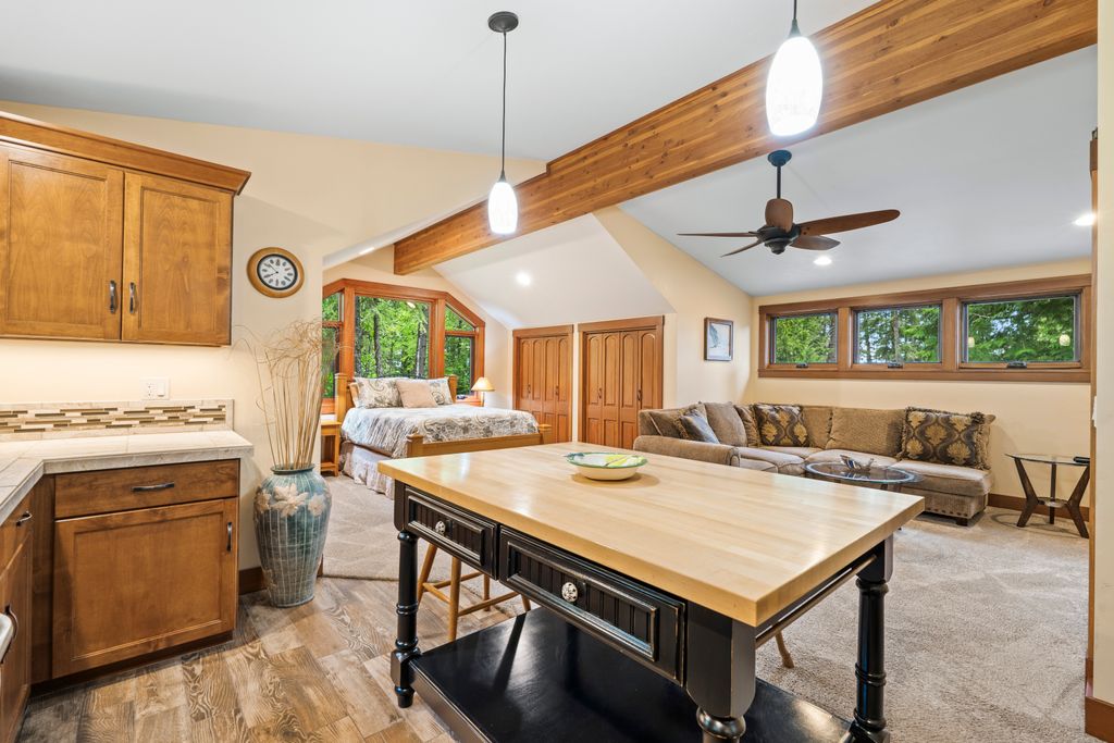 Meticulously constructed and artfully nestled into the foothills below Schweitzer Mountain, this exceptional property offers a rare blend of luxury, comfort, and natural beauty. With sweeping views of the surrounding mountains and the sparkling lake beyond, this home is a true haven for those seeking serenity, space, and inspired design. Bathed in abundant sunshine and softened by gentle mountain breezes, the home welcomes each day with stunning sunrises and a chorus of native wildlife. This 7.93-acre property is dotted with huckleberry bushes and thoughtfully landscaped with deer-resistant shrubs and perennials, providing a low-maintenance yet vibrant outdoor living experience. Inside, an open floorplan showcases exquisite craftsmanship, from exposed cedar beams, soaring tongue-and-groove ceiling to wide plank, wood grain tile flooring. Floor-to-ceiling windows frame breathtaking views and flood the home with natural light, while radiant in-floor heating keeps every space warm and inviting. The full masonry gas fireplace, clad in real stone veneer, anchors the great room with timeless mountain elegance. The gourmet kitchen is a chef’s dream, featuring ivory quartz countertops, a contemporary stone backsplash, high-end appliances and ample storage. The primary suite is a true retreat, with private access to two outdoor spaces, including a secluded deck with hot tub overlooking tranquil Schweitzer Creek. The en-suite bath is filled with natural light and finished with quartz countertops and heated travertine floors. Additional living spaces include a beautifully appointed 700 SF guest studio above the garage with a separate entrance, full kitchen, and bath—perfect for multi-generational living or guest accommodations. Two detached 320 SF custom studio spaces expand the property’s versatility. One features a kitchenette and bathroom, ideal for a home office, art studio, or guest quarters. The other is an off-grid escape overlooking the peaceful Selle Valley, offering unmatched privacy and inspiration. Whether you’re taking in the views or enjoying a peaceful stroll down to Schweitzer Creek, this one-of-a-kind mountain sanctuary offers not only a place to live—but a way of life.